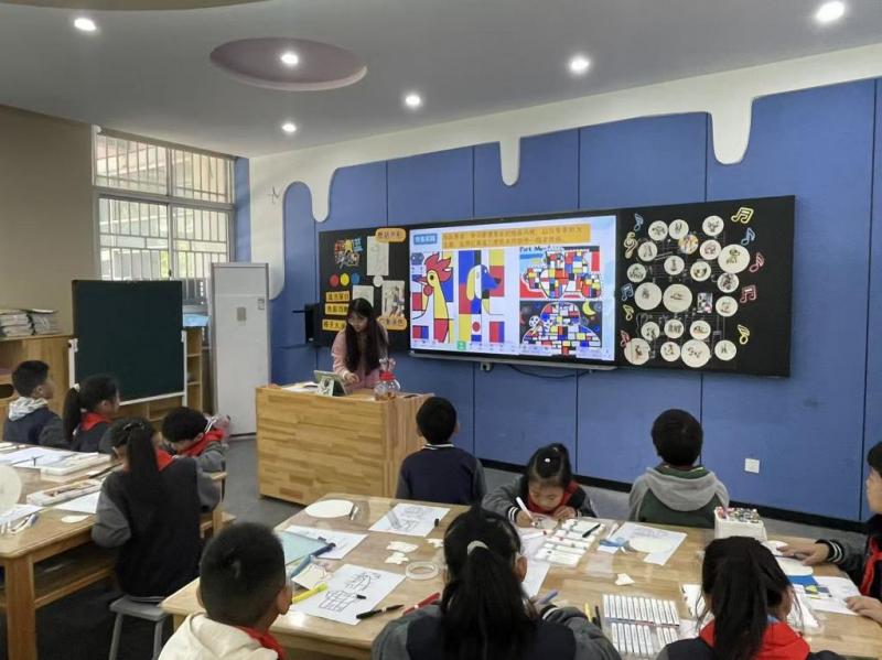 黄萍老师的三年级课程《红黄蓝交响》,以“为音乐设计封面”为创意切入点,通过“节奏快慢连一连”的趣味任务,自然衔接三原色认知环节。“10秒找红黄蓝”的限时挑战调动学生感官,蒙德里安经典作品赏析则搭建起色彩与艺术的桥梁,学生们在互动中直观感受红色的喜庆热烈、黄色的温暖明亮、蓝色的宁静清凉,将抽象的色彩知识与具象的情感体验深度绑定。